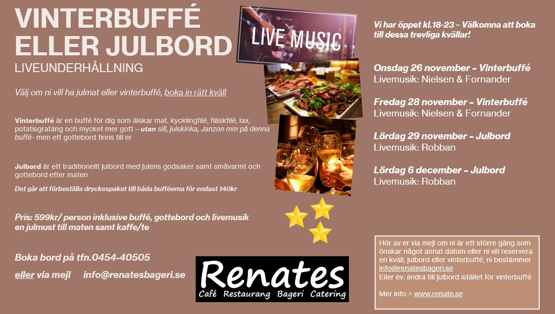 Maten till dessa bufféer betalas senast 1 vecka innan på Renates eller via Swish, Dryckespaket betalas också i förväg