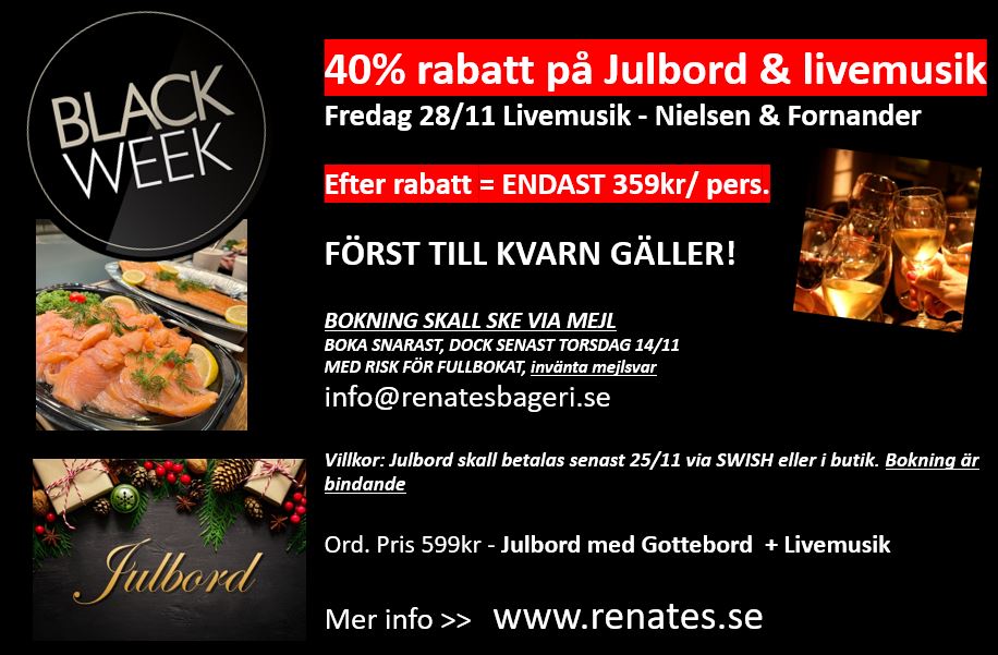 BLACK WEEK REGLER- Gällande Julbord 28/11. Bokning sker via mejl info@renatesbageri.se för att få 40% rabatt.