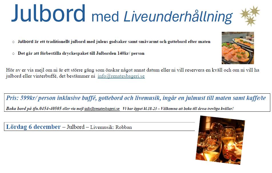Maten till Julborden betalas senast 1 vecka innan på Renates eller via Swish, Dryckespaket betalas också i förväg