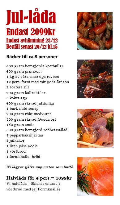 Jullåda Beställs senast 20/12 kl.15 Beställs i butik eller via telefonAvhämtning 23/12 kl.10-17