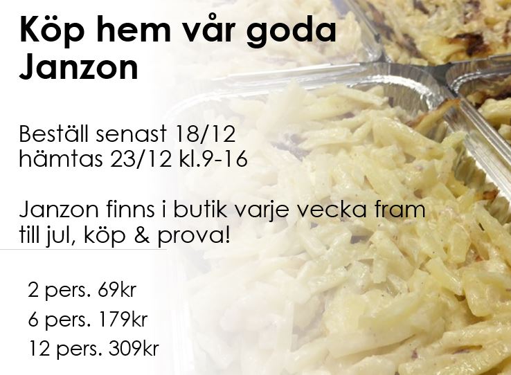 Småvarmt består av: Janzon Frestelse, hemgjorda köttbullar, prinskorv