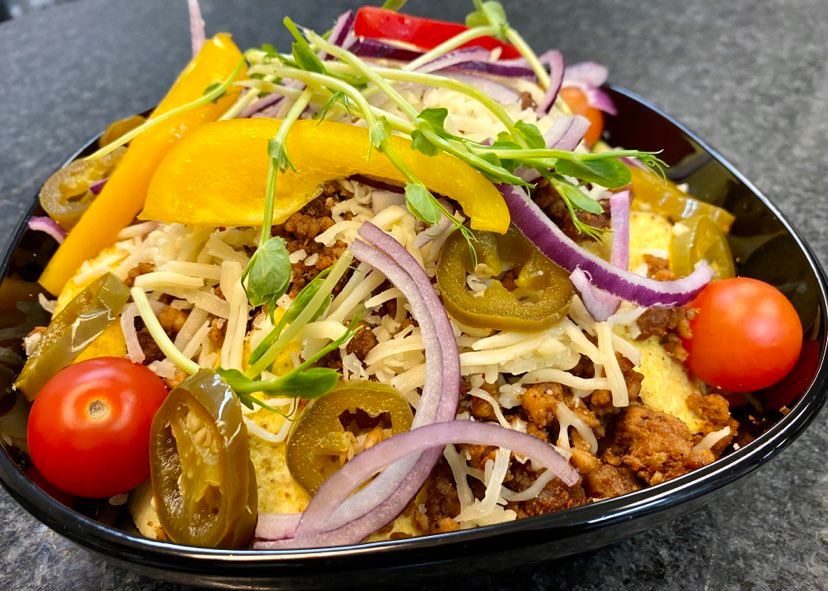 Salladsost (8 bitar), 2 bitar bacon, crème fraiche, oliver (8 stycken), extra burk dressing, färsk riven Parmesan liten skål, tacosås